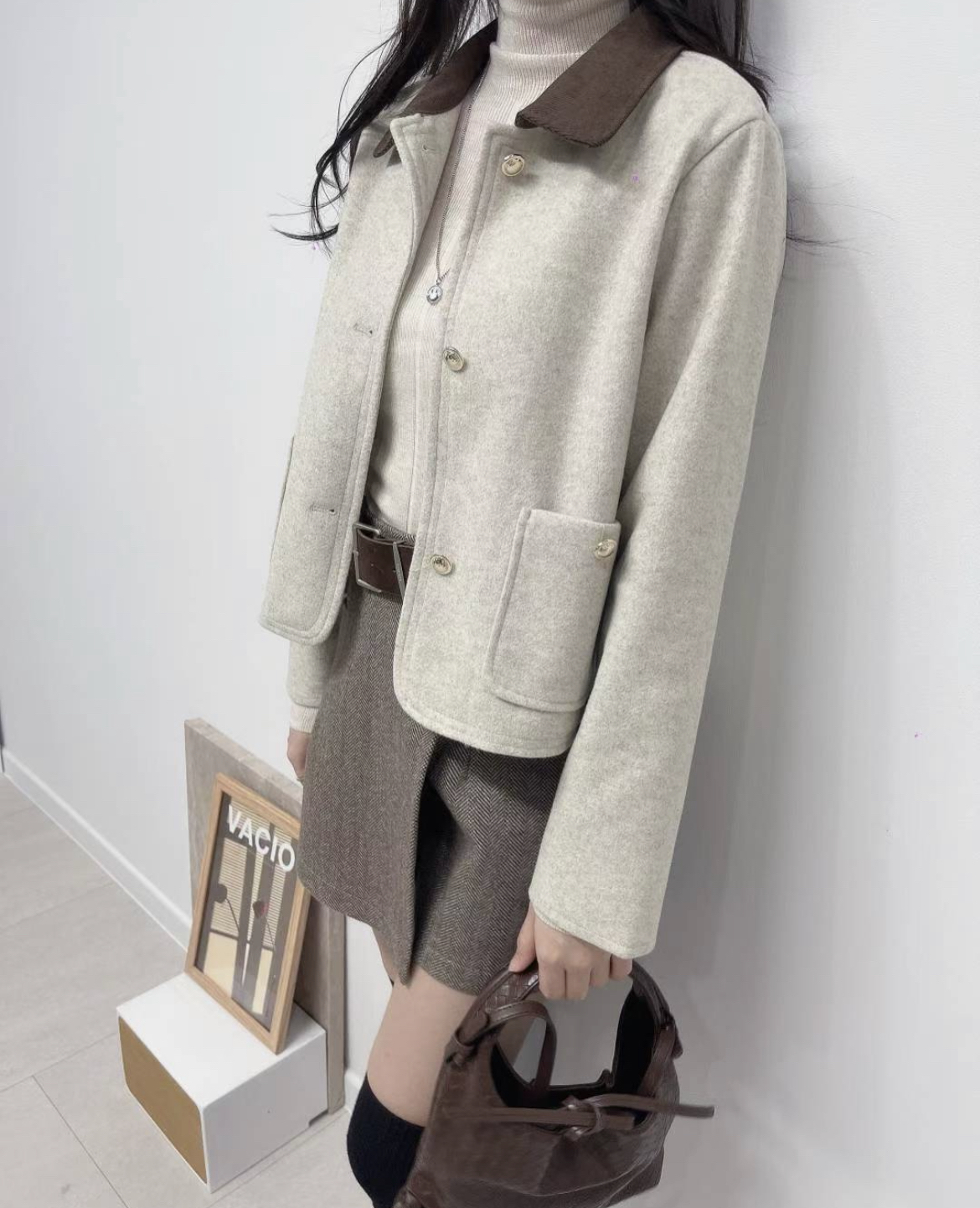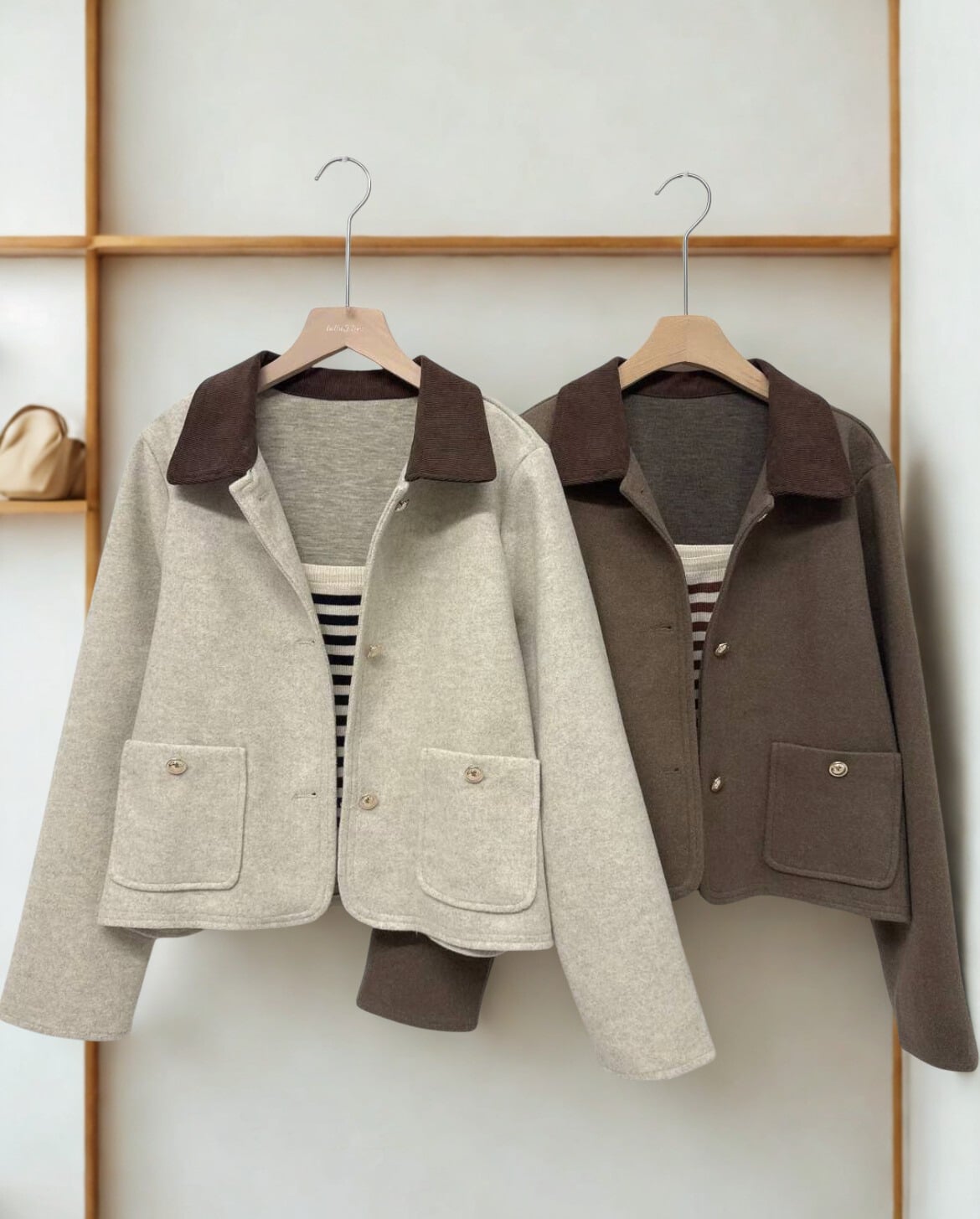♡ 拼接燈芯領口袋短外套。